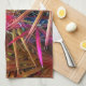 In the original, abstract artwork by ZoeSPEAK on this Kitchen Towel, the tropical riot of colors was made from Zoe’s original photograph of saw palmetto. Some of the palm fronds remain their natural green, but others have changed to hot pinks and reds, yellows, blues and warm browns, as they zigzag between each other in the pine grove.