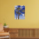 A vivid and interesting perspective view painting of palm trees against a summer sky.