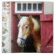 Design of a palomino relaxing at the end of the day looking out of the barn door at his farm.