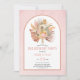 Soft pink arch engagement party invitation with tropical dried palm leaves, pampas grass and protea flowers. This lovely wedding design has an arch frame on a blush pink stained background. A watercolor bouquet of dried palm leaves, protea flowers and pampas grass is displayed in the frame.