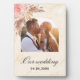 Golden marble print as background. Decorated with blush pink and rose gold florals and pampas grass. Personalize and add your wedding photo, and the date.
