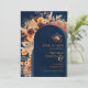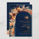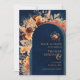 Stunning, modern QR code save the date wedding invitation featuring boho pampas grass floral elements in terracotta, rustic autumn cottage hues with arch, against a navy blue background. Add the URL of your wedding website on the reverse of the card and the QR code will be updated, or delete if not required. Click on personalize/customize further to include your own details.