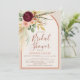 Celebrate the bride to be with this Boho Floral Arch Bridal Shower invitation, featuring an elegant watercolor floral bouquet of burgundy red chrysanthemum blooms, blush pink roses, eucalyptus greenery, pheasant feathers, dried pampas grass foliage, golden autumn leaves and more. The design is framed by a graceful yet modern arch in warm terracotta rust orange and soft oatmeal beige for a natural, earthy feel. With its modern rustic boho style, this invitation sets the perfect tone for a western, boho, or fall celebration. Pair with coordinating signs, thank you cards, games, favors, and décor from the Boho Floral Arch event suite for a beautifully cohesive bridal shower.