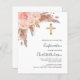 Rose gold and blush pink florals, roses and pampas grass and a golden cross. Personalize and add a name and details.