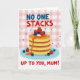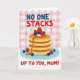 Designed with a cozy breakfast theme, the illustration centers on a tall stack of golden, fluffy pancakes filling the lower half of the card. A glossy ribbon of amber syrup slides down one side, catching the light like a sweet slow hug. On top, bright red strawberries and deep blue blueberries sit close together, and a few extra berries rest near the base on a pale blue plate, adding a gentle, caring touch ❤️. Behind the pancakes, a soft pink-and-white gingham background sets a homey scene, sprinkled with tiny blue heart shapes that feel like quiet signs of affection. Across the upper area, the message “NO ONE STACKS UP TO YOU, MUM!” is placed in chunky, slightly uneven lettering, with red and blue words alternating for contrast. The text sits above the pancake tower, leaving the food illustration to take center stage while still feeling close and friendly 🌼. Small blue hearts dot the checkered background around the headline and continue down toward the plate.