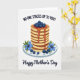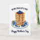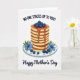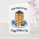 This card features a tall stack of golden pancakes, each layer looking soft and cozy, like a sweet breakfast shared with someone close ❤️. Glossy amber syrup drips down the sides in slow ribbons, adding a rich shine that feels like an invitation to linger together. A mound of deep blue berries sits on top, their cool tone contrasting with the warm pancake colors and hinting at a gentle, affectionate moment across the table. The stack rests on a white plate sprinkled with extra berries, making the scene feel cared for and thoughtfully arranged. Two small five-petaled blue flowers and a few green leaves curl around the plate, adding a fresh, garden-like touch 🌼. The background stays bright white, keeping the focus on the food and the soft, tender mood in the composition. Simple decorative lettering appears above and below the pancakes, set in a dark tone that stands out clearly against the pale background. The lower text sits beneath the plate while the upper text floats near the top edge, framing the syrupy stack and the scattered berries.