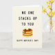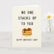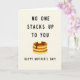 This greeting card features a soft, creamy background with a simple digital illustration centered on a stack of three golden-brown griddlecakes resting on a small white plate near the lower middle. The rounds look gently toasted, and the cozy breakfast scene feels like a sweet, shared moment between close hearts ❤️. A pale yellow pat of butter sits on top, slightly melting as dark amber syrup drips down the sides in glossy ribbons, adding a tender, indulgent touch. Across the upper portion, large black sans-serif text reads “NO ONE STACKS UP TO YOU,” spaced clearly so it stands out against the light backdrop. Below the pancakes, smaller black text says “HAPPY MOTHER’S DAY!” placed neatly as a supportive line under the illustration. The minimal linework keeps the focus on the warm food tones and the affectionate message, like a quiet compliment offered over breakfast 🌼. The syrup catches small highlights as it slides down the stack, pooling lightly along the plate’s edge.