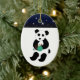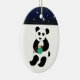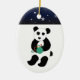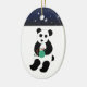 A starry night and a little panda bear sits holding a bright green ornament with ribbons in his paws.
