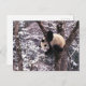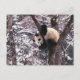 Panda cub playing on tree covered with snow, postcard