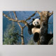 A Panda In a tree poster.has a black and white panda sitting up at the top of a tree with a forest behind him and a blue sky.this is a beautiful photo.