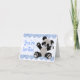 This sweet baby shower invitation features two rows of blue hearts and an adorable panda bear with a pacifier in its mouth holding a baby bottle.
