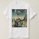 A.I. created surreal print of a surreal desert landscape of jagged cliffs features a melting, metallic skull suspended above Pandora's box of ancient Greek Mythology after it has been opened and the evils of the world released.