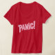 Typographical slogan t-shirt in light pink text. Reads: Panic!. Ideal created from a panic! Text design by Sarah Trett.