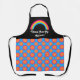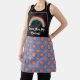 Women's apron with an image of a pansexuality pride flag and a rainbow, and repeating seamless flower pattern; pink, yellow, and blue design on a black background, a blue variant, with a customizable text template for your own name or message