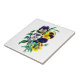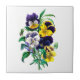 Vivid purple and yellow pansies bunch on white ceramic tile.