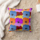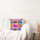 This throw pillow has a Spring design of purple, blue, orange, and red with yellow pansies layered on each other on a field of yellow.