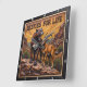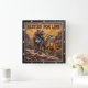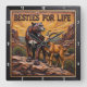 This dramatic square wall clock features a highly dimensional, close-up illustration of a brown panther (or leopard) and a white, happy goat standing side-by-side. The entire design is rendered in muted brown, tan, and dark leather-like tones, strongly suggesting a deep sculpted relief or Sculpted Leather Look. The panther has textured spots and is positioned on the left, while the goat is on the right, smiling with large horns. The background features detailed rocky terrain and stylized trees carved behind the animals, giving a mountain habitat impression. The entire foreground is textured, resembling carved rocks and ground cover. The large, three-dimensional embossed text "BESTIES FOR LIFE" is carved across the top center in a bold, golden serif font. The clock face features a simple clock face border with large, white, numbered tick marks (1 to 12) integrated into the outer frame. The artwork is surrounded by a thick, dark brown decorative border that resembles a black wood frame.