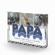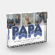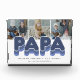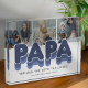 Modern family photo block featuring 3 square pictures for you to replace with your own, the title "PAPA", a personalized saying that reads "the man, the myth, the legend", and the grandkids names.