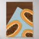 A vibrant illustration featuring fresh papaya halves with bold orange flesh and dark seeds, placed on a cool blue grid cloth against a warm brown background. This tropical design brings a touch of island vibes and boho charm to any space. Perfect for kitchen wall art, fruit-themed prints, summer stationery, or home décor items. A refreshing artwork for those who love colorful modern art with a tropical twist.