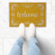 This coir doormat features a yellow floral design inspired by papel picado, a traditional Mexican folk art. Embellished with flowers and greenery, it brings a touch of cultural sophistication to your entryway. Additionally, the doormat prominently displays the word 'Welcome' in a unique typographic style.