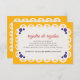 The Papel Picado Yellow Nuestra Boda Spanish Wedding Enclosure Card frame is adorned with a cutout pattern resembling a papel picado effect, adding a traditional Mexican touch. Accented with floral and geometric details in vibrant colors, the design exudes warmth and charm, making it perfect for a romantic wedding stationery.