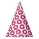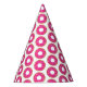 Paper Birthday party hats with pink donut print. Fun colorful cone hats. Cute design for themed Birthday party.