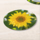 Beautiful, bright yellow sunflower with green leaves in the background on this paper coaster.
