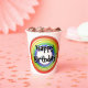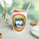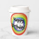 Concentric, three dimensional circles, in purple, blue, green, yellow, orange, and red, are duplicated on two sides of cup. Centered over the two sets is text "Happy Birthday!" Black text has a white background shadow.