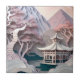 A lovely faux paper cutout landscape ceramic tile with mountains, pavilion, and trees.