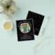 VALUE PAPER SHEET FLYER WITHOUT ENVELOPES. Holiday Open House Christmas Party Black Flyer Invite. A budget price SMALLER 4.5” x 5.6” alternative. The header is curved around a circular illustration of a festive decorated front door, and a coordinating black background with snow pattern is on the back. Easily personalise the text to your own details.