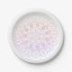 Mosaic design with four pattern rings. Central circle of six segments, next circle has six ovals with circles inside. Eleven small sunbursts inside band that is trimmed with tiny circles. Fifteen diamond petals holding a circle create the outer ring. Simple, elegant design filtered with a faint coloring of the rainbow.