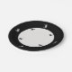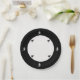 A wide black rim surrounds the white center circle of the plate. At outer edge of circle are four black cats. Flying around the outer ring are four witches in white.