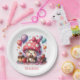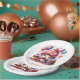 A cardboard plate featuring a happy mushroom, balloon holder, chocolate, and Friso cake, with a customizable name.