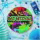 Fun paint splatter design for your Bat Mitzvah celebration. Bright colors of green, pink, blue, red, purple and orange.