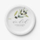 Elevate your event with these elegant olive paper plates, featuring a minimalist watercolor greenery design. The simple yet sophisticated botanical pattern in shades of green is perfect for rustic weddings and bridal showers. The trendy modern script typography showcases the words "we did," adding a touch of elegance to your celebration. Personalize with your custom greeting, names, and wedding date using the template fields provided.