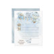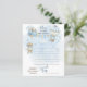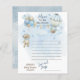 It's a Boy and We Can Bearly Wait Baby Shower "Advice" script text design "For the New Parents" featuring a teddy bear with a blue bow-tie hanging on to a bunch of balloons on one side with an air balloon carrying a floral bouquet on the right side. Bunting flags hang between the two balloons. Clouds and stars on a blue watercolor background round out the design. Back features a watercolor sky look background with white and beige polka dots. Composite design by Holiday Hearts Designs. Flat paper version -- Also available in an invitation version for print or download.