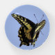 Swallowtail butterfly specimen is isolated against a light blue background. Yellow and black wings and Antennae are very visible.