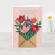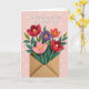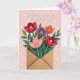 Designed with a soft blush-pink background dotted with small white polka dots, this card features a layered paper-cut style floral scene that feels sweet and close, like a gentle hug ❤️. At the bottom center sits an open, unsealed kraft-paper envelope, and a full bouquet rises from it as if it was just sent to someone special. Five stylized flowers stand out in two deep reds, one warm coral, one pale pink, and one rich violet, each with stacked petals that add depth and a tender, cared-for look. Their golden-yellow centers glow with tiny stitch-like marks, giving the blooms a cozy, crafted touch. Curving green stems and leafy sprigs weave together, leaning toward one another the way close friends might, with a calm, affectionate energy 🌼. Above the bouquet, a white cursive-style message is placed near the top center, floating lightly over the flowers and contrasting clearly against the pink. The envelope shows subtle folded edges and a slightly darker inner flap, while the bouquet spreads upward in a loose fan shape beneath the white text.