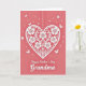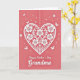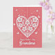 This greeting card features a coral pink background with a large white heart centered on the front, detailed with lace-like flowers and curling vines that feel like an affectionate embrace ❤️. The heart is rendered with crisp cutout-style edges and soft shadowing that adds gentle depth without looking heavy. Around it, small white blossoms and a few delicate butterflies drift across the space, suggesting a light, romantic flutter in the air. A dotted vertical line runs near the upper right side, giving the layout a subtle sense of structure. Beneath the heart, a short message sits centered in flowing lettering, printed in a dark gray tone that stands out clearly against the warm backdrop. The background reads as smooth and matte, while the white decorative elements look slightly raised, like layered paper. Tiny floral accents continue to speckle the open areas, keeping the composition airy and calm 🌼. The central heart remains the brightest element, framed by the scattered white flowers and butterflies against the coral field.