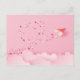 Papercut paper airplane with hearts in the jet stream in a pink sky with pink clouds.