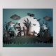 Papercut-look Halloween scene with a zombie hand breaking out of the ground in a cemetery with bats and ghost all around.