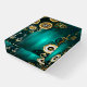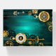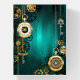 Jewelry, gold watch with a gold chain and keys on a green textural background. Steampunk style.