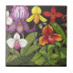 Original fine art design of colorful Paphiopedilum and Phragmapedium or Lady's Slipper orchids by artist Carolyn McFann on a quality tile for orchid lovers.