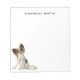 Image of a cute Papillon breed dog in the lower left hand corner set on solid white. Personalize with your name or message in black uppercase minimalist font.