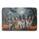 Unleash the spooky spirit with this eerie Halloween design featuring a pack of dogs under a dark, moonlit sky, surrounded by flying bats and glowing pumpkins. Perfect for those who love a touch of frightful fun with their furry friends!