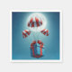 A blue gift box with red and white parachutes descends through a starry night sky, while the full moon glows brightly in the background.
