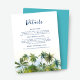 Tropical theme wedding details enclosure card features reception, accommodations and wedding website information for your guests in a deep blue font bordered by a watercolor of lush island palm trees perfect for beach and destination weddings. The reverse side features a monogram with first name initials that can be personalized on a tranquil turquoise background. Art by KL Stock