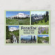 Postcard featuring photos taken at Paradise in Mt Rainier National Park. Includes photos of Paradise Inn, Myrtle Falls, wildflowers, and views of Rainier and the Tatoosh Range.