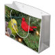 Yellow and green parakeet, or budgie, in a Christmas tree visiting with the red cardinal ornament bird lovers Christmas holiday gift bag. IMAGE WILL ONLY BE CORRECT ON THIS, THE LARGE SIZE BAG