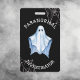 Paranormal Investigator badge with a white sheet ghost on a black background. Spooky cobwebs frame a top and bottom corner of the badge. The back of the badge has a black background. You can add text or a photo here if you wish. Customize the text on the front of the badge to suit! The font style can also be changed using the Design Tool and the text repositioned and removed. This badge will look great as part of a Paranormal Investigator’s attire or worn for fun with a Halloween costume.